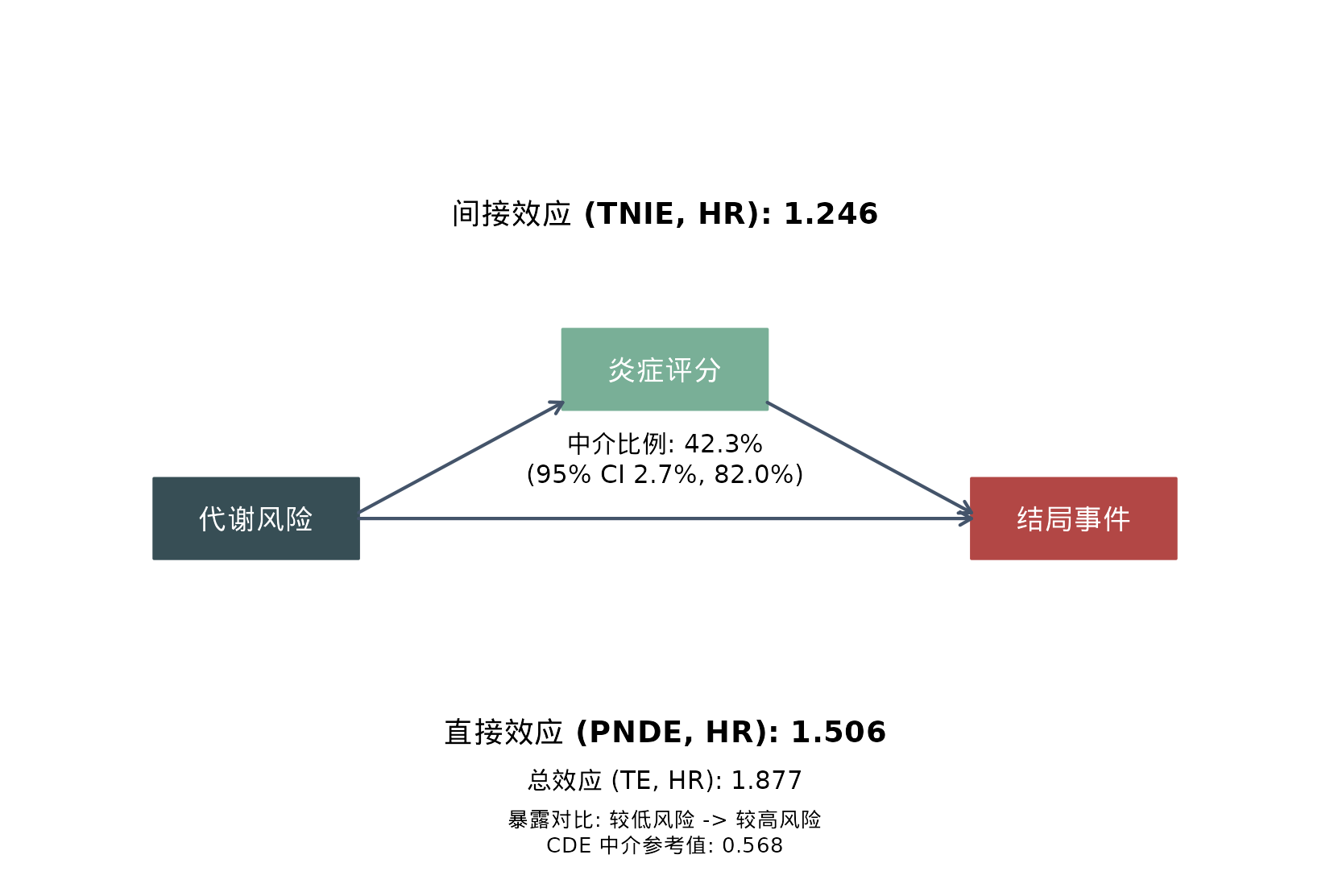 在这组模拟数据中,较高代谢风险与更高事件瞬时风险相关,并且结果与“炎症评分承担了其中一部分路径”这一解释一致。
